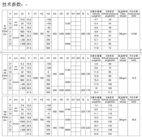 4、表中列出的起升速度,大小車速度為標(biāo)準(zhǔn)值,可以根據(jù)客戶的需求做相應(yīng)的調(diào)整。
